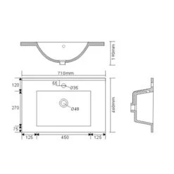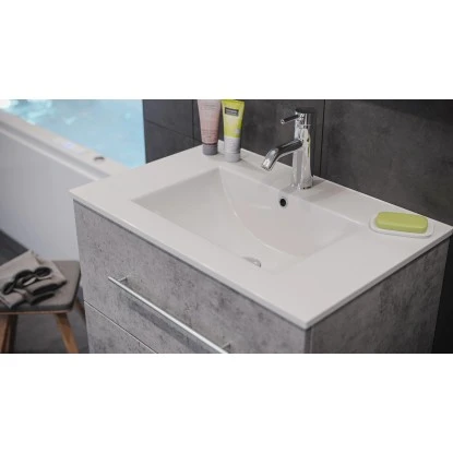 Das Keramik-Waschbecken ist in einem modernen, eckigen Design gestaltet. Mit seinem breiten Rand bietet es Abstellflächen auf allen Seiten. In den Waschtisch integriert ist ein Überlaufloch, das das Überlaufen des Waschbeckens verhindert.