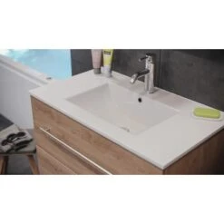 Das Mineralguss-Waschbecken ist in einem modernen, eckigen Design gestaltet. Mit seinem breiten Rand bietet es Abstellflächen auf allen Seiten. In den Waschtisch integriert ist ein Überlaufloch, das das Überlaufen des Waschbeckens verhindert.