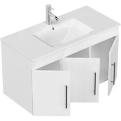 Der Posseik Waschtisch Teramo überzeugt mit der Kombination eines hochwertigen Waschbeckens mit einem praktischen Unterschrank. Das Keramik-Waschbecken ist in einem modernen, eckigen Design gestaltet. Mit seinem breiten Rand bietet es Abstellflächen auf allen Seiten. In den Waschtisch integriert ist ein Überlaufloch, dass das Überlaufen des Waschbeckens verhindert.Das Waschbecken ist in einen praktischenUnterschrank eingefügt. Dieser führt die modernen, eckigen Formen des Beckens fort. Das Badmöbel verfügt über drei Türen mit Soft-Close-Systemen für schonenderes Schließen. Der Waschbeckenunterschrank ist aus MDF gefertigt und in den Innenraum mit Melamin beschichtet. So ist er besonders feuchtigkeitsresistent und zudem leicht zu reinigen. Die Handgriffe sind aus matt gebürstetem Edelstahl.