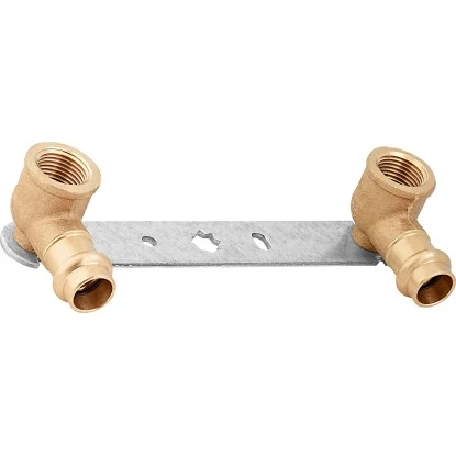 Die Press-Montageeinheit mit zwei Pressfittings kommt zum Einsatz, um zwei mal zwei Rohranschlüsse dauerhaft zu verbinden. Die Montagehilfe wird speziell in Verbindung mit Kupferrohren verwendet. Die beiden Fittings bestehen aus Rotguss. Die Form der Fittings ist jeweils ein 90 °-Winkel, zur Richtungsänderung der Rohrleitung. Die Winkel bieten auf der einen Seite einen Rohrdurchmesser von 15 mm und auf der anderen Seite ein Innengewinde mit 18,6 mm (Rp 1/2). Die Fittings sind im Abstand von 150 mm auf der Montageschiene befestigt. Zur Anbringung werden Fitting und Leitung verpresst bzw. verschraubt. Zur einfachen Befestigung der Schiene am Untergrund sind vorgebohrte Löcher vorhanden. Der Einsatz der Fittings in Trinkwasserleitungen ist erlaubt.