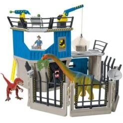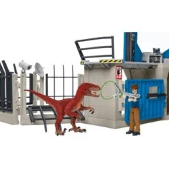 Team Dino, bestehend aus den 3 Colby Brüdern Maxx, Luis und Flynn machen sich auf den Weg um die Geheimnisse zu lüften! Maxx, der Anführer, hat auf der großen Dino-Forschungsstation von Schleich® Dinosaurs jede Menge zu tun. Die Station bietet neben der Kommandotzentrale eine Aussichtsplattform mit schwenkbarer Betäubungspfeil-Kanone sowie einen Kran. Im unteren Bereich befindet sich ein Quarantäne-Raum für frisch eingefangene Dinos. Hier können sofort die ersten Untersuchungen gemacht werden und dann die Dinos durch die Falltüre ins Gehege gelassen werden. Oh nein! Der Velociraptor ist ausgebrochen! Kann Maxx ihn mit seiner Stabwaffe wieder einfangen? Das Spielset bietet jede Menge Zubehör und 2 Dinos in cooler Bemalung.