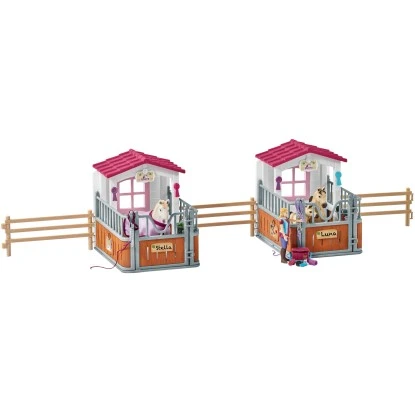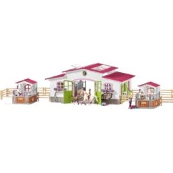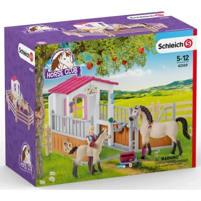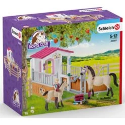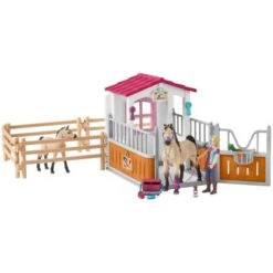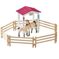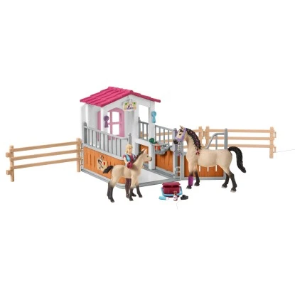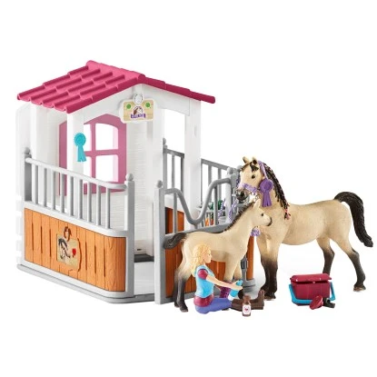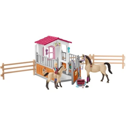Die erfahrene Pferdepflegerin führt die Araberstute und ihr Fohlen aus der Pferdebox. Mit Striegel und Kardätsche werden die beiden liebevoll geputzt. Dabei fällt eine kleine Verletzung auf, die mit einem Medikament und einer Haftbandage verarztet werden. Wie es den beiden Pferden geht, lässt sich über das abnehmbare Dach beobachten. Die Schleich® Figuren sind alle detailgetreu modelliert und stehen für pädagogisch wertvolles Spielen.