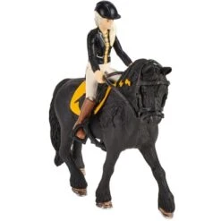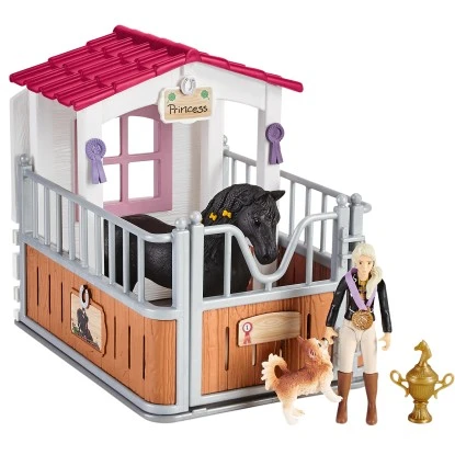 Die Pferdebox mit Horse Club Tori & Princess von Schleich® Horse Club ist liebevoll gestaltet. Siegerschleife, Goldmedaille und Pokal zeigen die gemeinsamen Reiterfolge der vollbeweglichen Mädchen-Figur Tori und ihrer wunderschönen Friesen Stute Princess. Die Wände der Box sind mit hübschen Stickern verziert, die beliebig beschriftet werden können. Das Dach ist abnehmbar und dient gleichzeitig als separater Unterstellplatz. Zaumzeug, Zügel und Sattel liegen griffbereit für das nächste Training – ebenso wie eine Karotte zur Belohnung. Während die Stute zufrieden an Raufe und Tränke steht, flitzt Toris lustiger Chihuahua Beauty um die Box.