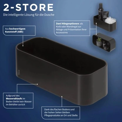 Mit dieser cleveren Lösung von Tiger schaffen Sie noch mehr Platz in Ihrem Badezimmer, zur Ablage oder PrĂ€sentation Ihrer Badezimmer-Accessoires. Diese Wandablage aus der 2-Store-Kollektion bietet Ihnen zwei Möglichkeiten: Nutzen Sie sie als Duschkorb in der Dusche oder an der Badewanne oder als Wandregal in Toilette oder Badezimmer.Schieben Sie die Ablage auf die Wandplatte, und Sie können immer wieder abwechseln. Diese Wandablage besteht aus Kunststoff und ist daher rostfrei. Dank des Wasserablaufs im Boden lĂ€sst sich die Ablage mĂŒhelos sauber halten, und dadurch bleibt der Duschkorb viele Jahre lang schön. Die schwarze Farbe verleiht Ihrem Badezimmer eine robuste Note und lĂ€sst sich mĂŒhelos mit anderen Accessoires kombinieren. Die Wandplatte kann auf zwei Arten befestigt werden: durch Kleben oder Schrauben. Falls Sie es bevorzugen, nicht in Ihre Fliesen zu bohren, nutzen Sie einfach den beigelegten TigerFix-Kleber. Dieser Kleber kann auf jeder glatten, festen FlĂ€che verwendet werden und lĂ€sst sich in einer feuchten Umgebung mit bis zu 10 kg belasten. NatĂŒrlich ist auch Schrauben mit den beiliegenden Edelstahlschrauben und FischerdĂŒbeln eine Option, so können Sie diese Mehrzweckablage auch auĂerhalb des Badezimmers nutzen.
