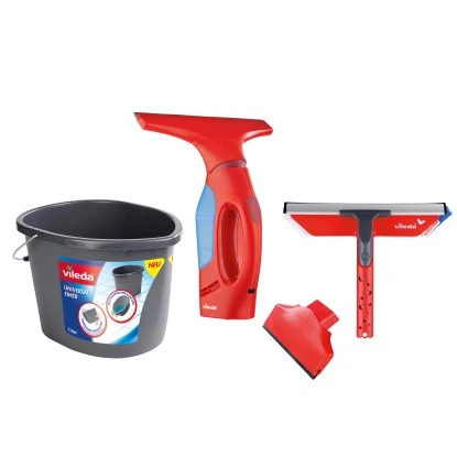 Das Komplet-Set besteht aus Windomatic Fenstersauger mit verbessertem Akku, Eimer, Einwascher und schmale SaugdĂĽse.