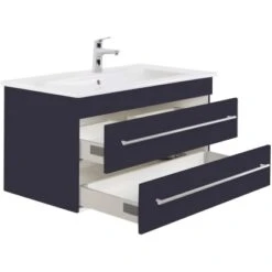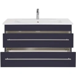 Das Waschbecken ist in einen praktischen Unterschrank eingelassen, der die geradlinigen Formen des Beckens fortführt. Das Badmöbel verfügt über zwei Schubladen mit Soft-Close-Systemen für schonenderes Schließen. Die Schienen verfügen über einen weichen Vollauszug, der Ihnen dauerhafte Übersicht über die gesamten Schubladen ermöglicht. Der Waschbeckenunterschrank ist aus hochwertigen MDF-Platten gefertigt, die über eine zusätzliche Markenbeschichtung verfügen. Die Schubladen sind innen mit weißem Melamin beschichtet. So ist er besonders feuchtigkeitsresistent und zudem leicht zu reinigen. Als besonderes Detail wirken die Griffe aus Edelstahl. Die Äußere Beschichtung schützt zusätzlich vor Wasserspritzern. Mit seinen Maßen von 50 cm x 95,3 cm x 47,7 cm (H x B x T) erhalten Sie mit dem Posseik Waschbeckenunterschrank praktischen Stauraum für Ihr Badezimmer.