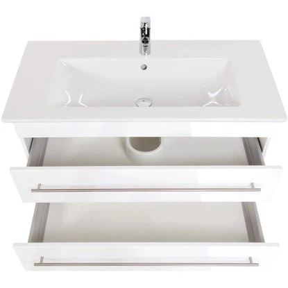 Das Waschbecken ist in einen praktischen Unterschrank eingelassen, der die geradlinigen Formen des Beckens fortführt. Das Badmöbel verfügt über zwei Schubladen mit Soft-Close-Systemen für schonenderes Schließen. Der Waschbeckenunterschrank ist aus hochwertigen MDF-Platten gefertigt, die über eine zusätzliche Markenbeschichtung verfügen. Die Schubladen sind innen mit weißem Melamin beschichtet. So ist er besonders feuchtigkeitsresistent und zudem leicht zu reinigen. Als besonderes Detail wirken die Griffe aus Edelstahl. Die Äußere Beschichtung schützt zusätzlich vor Wasserspritzern. Mit seinen Maßen von 50 cm x 95,3 cm x 47,7 cm (H x B x T) erhalten Sie mit dem Posseik Waschbeckenunterschrank praktischen Stauraum für Ihr Badezimmer.