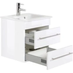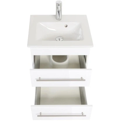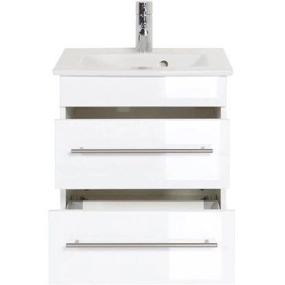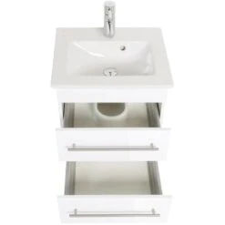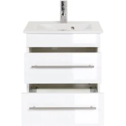 Das Waschbecken ist in einen praktischen Unterschrank eingelassen, der die geradlinigen Formen des Beckens fortführt. Das Badmöbel verfügt über zwei Schubladen mit Soft-Close-Systemen für schonenderes Schließen. Die Schienen verfügen über einen weichen Vollauszug, der Ihnen dauerhafte Übersicht über die gesamten Schubladen ermöglicht. Der Waschbeckenunterschrank ist aus hochwertigen MDF-Platten gefertigt, die über eine zusätzliche Markenbeschichtung verfügen. Die Schubladen sind innen mit weißem Melamin beschichtet. So ist er besonders feuchtigkeitsresistent und zudem leicht zu reinigen. Als besonderes Detail wirken die Griffe aus Edelstahl. Die Äußere Beschichtung schützt zusätzlich vor Wasserspritzern. Mit seinen Maßen von 50 cm x 46,6 cm x 40 cm (H x B x T) erhalten Sie mit dem Posseik Waschbeckenunterschrank praktischen Stauraum für Ihr Badezimmer.
