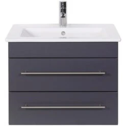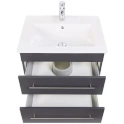 Das Badmöbel von Posseik in Anthrazit Seidenglanz überzeugt mit der Kombination eines hochwertigen Waschbeckens aus weißer Keramik von Villeroy & Boch und ist aufgrund seiner kompakten Bauweise auch für kleinere Badezimmer oder Gästezimmer geeignet. In ansprechendem Anthrazit gehalten passt dieses moderne Badmöbel hervorragend zu verschiedenen Badeinrichtungen. Aufgrund der hochwertigen Materialqualität profitieren Sie von optimierter Haltbarkeit und langer Lebensdauer.