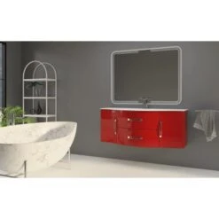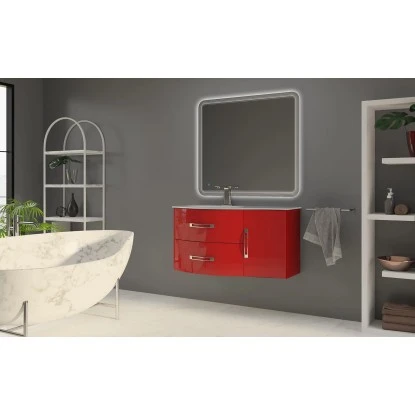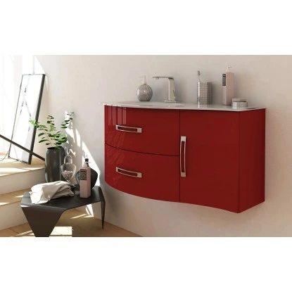 Die Badmöbelserie Best zeichnet sich durch modernes Design und attraktiven Hochglanz-Fronten in Rot aus. Die Badmöbel bestehen hauptsächlich aus PVC-foliiertem MDF-Holz, welches mittels deutscher Technologie verarbeitet wurde und somit einem sehr hohen Qualitätsstandard entspricht. Der elegante Waschbeckenunterschrank lässt viele Kombinationsmöglichkeiten zu und kann mit den passenden Waschbecken sowie Unterschränken sowohl als ein einzelner Waschplatz wie auch als Doppel-Waschplatz eingesetzt werden. Der Waschbeckenunterschrank ist mit zwei geräumigen Schubladen mit integriertem Soft-Close-System ausgestattet.