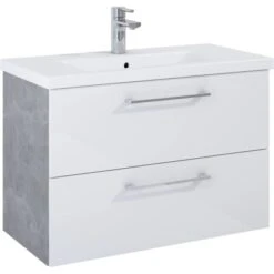 Der Waschbeckenunterschrank Cheese zeichnet sich durch ein modernes Design und eine hochwertige Verarbeitung aus. Der Korpus ist in einer Beton Koloristik gehalten und die Front im klassischen Weiß. Der Waschbeckenunterschrank verfügt über zwei Schubladen, die mit einem Soft-Close-System ausgestattet sind, welches ein einfaches und geräuschloses Schließen ermöglicht. Er ist zur einfachen Selbstmontage geeignet und mit dem ebenfalls erhältlichen, nicht im Lieferumfang enthaltenen Waschbecken schaffen Sie ein harmonisches Gesamtbild.