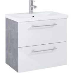 Der Waschbeckenunterschrank Cheese zeichnet sich durch ein modernes Design und eine hochwertige Verarbeitung aus. Der Korpus ist in einer Beton Koloristik gehalten und die Front im klassischen Weiß. Der Waschbeckenunterschrank verfügt über zwei Schubladen, die mit einem Soft-Close-System ausgestattet sind, welches ein einfaches und geräuschloses Schließen ermöglicht. Er ist zur einfachen Selbstmontage geeignet und mit dem ebenfalls erhältlichen, nicht im Lieferumfang enthaltenen Waschbecken schaffen Sie ein harmonisches Gesamtbild.