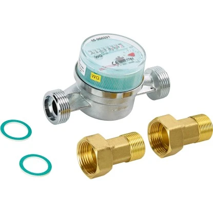 Mit dem Wasserzähler wird eine Messung des Warmwasserverbrauchs ermöglicht. Er überzeugt mit einer verchromten Oberfläche, die kratz- und korrosionsfest ist. Der Wasserzähler hat eine Baulänge von 130 mm und ist an beiden Seiten mit einem Außengewinde von 26,4 mm (R 3/4) ausgestattet. Er besitzt zusätzlich Verschraubungen, durch die das Gerät mit der Leitung verbunden werden kann. Der Zähler ist als Volltrockengeläufer ausgeführt und verfügt über einen drehbaren Zählwerkskopf. Der Dauerdurchfluss beträgt 4 m³/h.