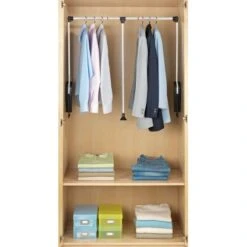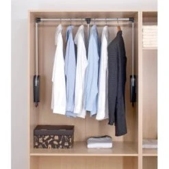 Der teleskopische Garderobenlift ist für Schrankinnenmaße von 87 cm bis 121 cm geeignet und verfügt über eine Soft-Rücklauf-Automatik. Das Montagematerial ist im Lieferumfang enthalten.