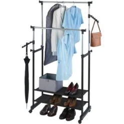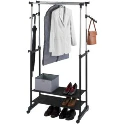 Kleidungsstücke können auf zwei in Höhe und Breite verstellbaren Stangen aufgehangen werden, während sich im unteren Bereich eine praktische Ablage für Schuhe befindet.