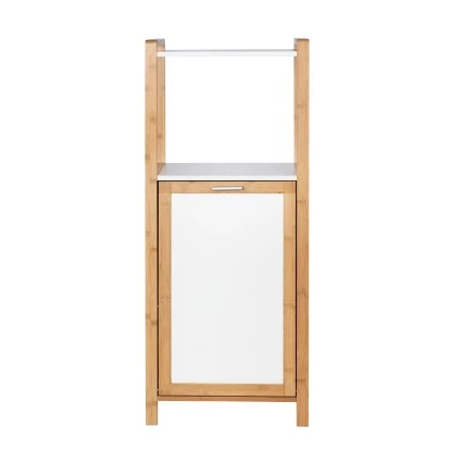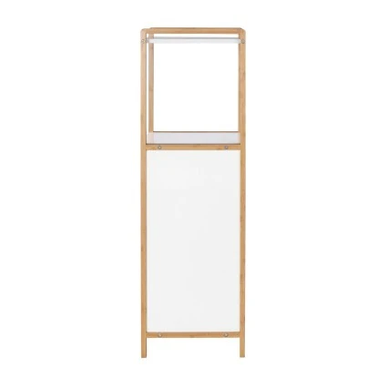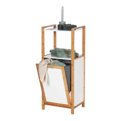 Modernes Regal bietet mit 2 Ablagen und herausklappbarem Wäschesammler viel Stauraum. Praktisch und vielseitig einsetzbar in Bad, Schlafzimmer und gesamtem Haushalt. Mit herausnehmbarem, grauem Einsatz aus PP-Faserstoff zum einfachen Transport der Wäsche. Aus umweltfreundlichem, schnell nachwachsendem Bambus, kombiniert mit MDF-Böden in Weiß. Maße (B x H x T): 40 x 95 x 30 cm