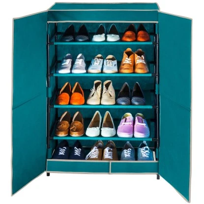 Der Schuhschrank ĂĽberzeugt durch einen stabilen Metallrahmen. Der stilvolle Schrank im trendigen Petrol ist aus Faserstoff gefertigt und dementsprechend atmungsaktiv.