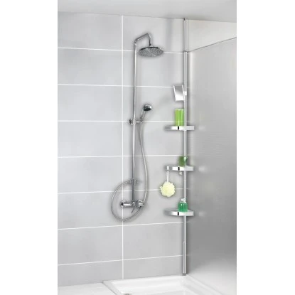 Das Teleskopregal ist von 70 bis 260 cm in der Höhe ausziehbar. Die silberfarbene Teleskopstange ist aus massiver, rostfreier Aluminium-Qualität gefertigt. Die hochwertigen Edelstahlblenden garantieren ebenfalls rostfreie Top-Qualität. Die Montage der praktischen Duschecke gelingt im Handumdrehen: Einfach zwischen Boden und Decke klemmen und fertig, ganz ohne Bohren und Schrauben.