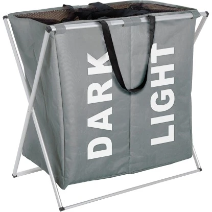Mit seinen 120 Litern Fassungsvermögen bietet er jede Menge dekorativen Platz für die Wäsche bis zum nächsten Waschgang. Durch die zwei praktischen Fächer mit je 60 Litern Fassungsvermögen kann die Wäsche vorab ganz einfach nach Farben oder Temperatur getrennt werden. Zum Hingucker wird der Sammler durch die hellen „Dark und Light“-Schriftzüge auf den beiden Körben.
